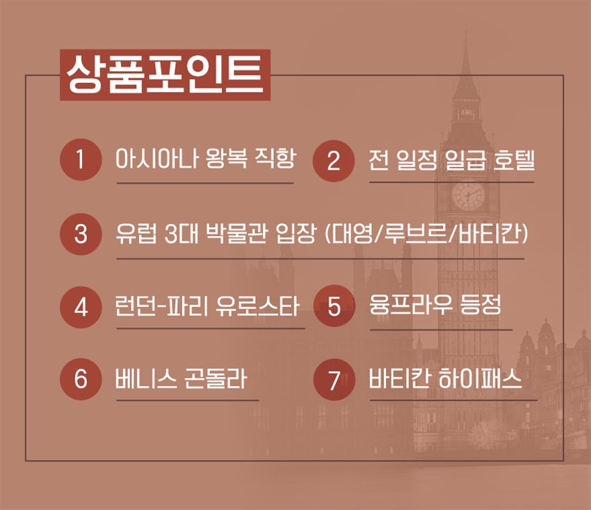 서유럽의 핵심 영국, 프랑스, 스위스, 이탈리아를 모두 볼 수 있는 일정. 국적기 직항은 물론 전일정 1급호텔로 편안한 여행